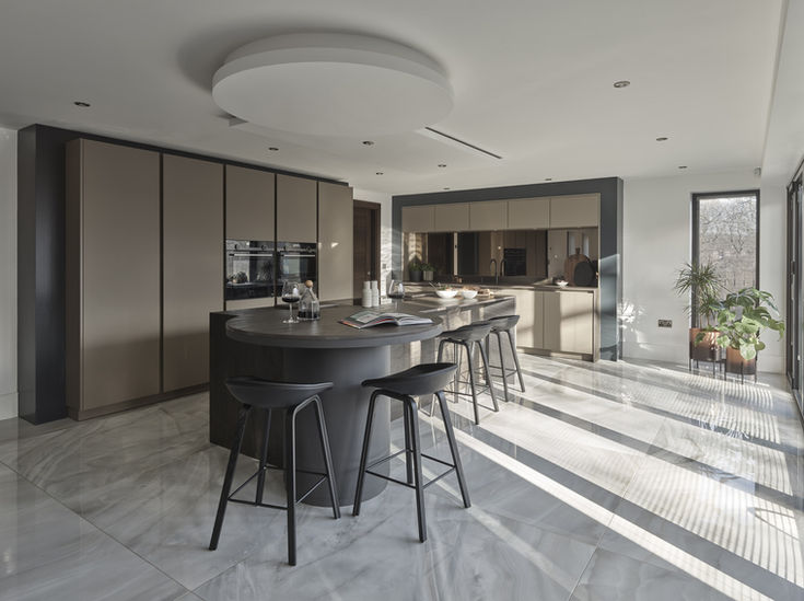 This project features SieMatic S2 furniture in SimiLaque velvet-matt finish with Dekton sintered stone worktops, circular feature breakfast bar, bevelled bronze mirror backsplash, Siemens appliances, BORA cooktop & extraction, Quooker matt-black boiling water tap.