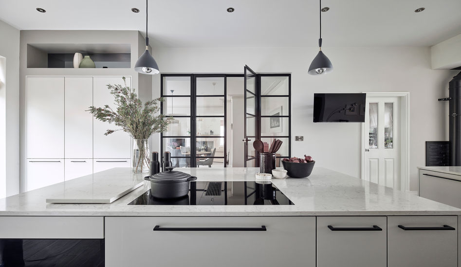 The project features SieMatic SC furniture in Sterling Grey with Silestone quartz worktops, Siemens appliances, BORA cooktop & extraction, Quooker boiling water tap. The Utility room features SieMatic SC furniture in Java Oak and SieMatic laminate worktops.
