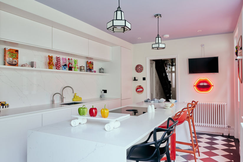 The solution was to create a kitchen that disappeared into the architecture, rather than appear overly functional, allowing their wild and idiosyncratic style to do the talking. Pure geometric and linear forms provide the subtle pragmatism of a kitchen while the delicate Wedgewood blue ceiling, gallery walls and striking checkerboard floor contrast to the crisp Lotus White cabinetry. A long open shelf above the sink offers a display area for playful décor.
