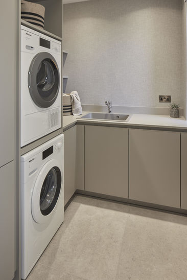 The utility features SieMatic SLC furniture in laminate Agate grey with SieMatic laminate worktops & Miele laundry appliances.
