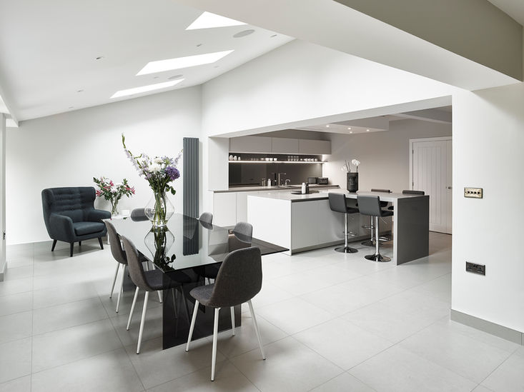 The clients wanted to continue the muted colour palette into the kitchen area, for the design to have clean lines and have a harmonious and elegant feel.