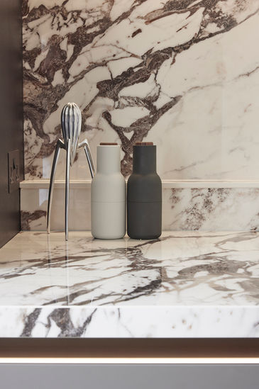 Thoughtfully considered lighting throughout the space softens the rich, dramatic veining in the stone and dark wood veneers and understated display areas feature playful finishing touches bringing personalised charm to the kitchen.