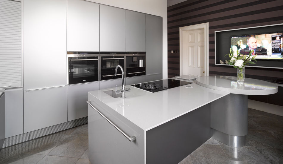 The project features aluminium and grey laminate doors with quartz work surfaces and breakfast bar, Siemens appliances, Westins extraction and Franke hardware.